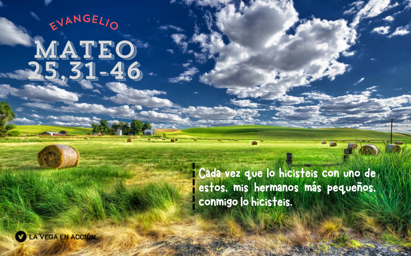 En el relato, el Hijo del hombre aparece en su gloria y reúne a todas las naciones para separarlas, “como un pastor separa las ovejas de las cabras”. A los de su derecha símbolo de los justos les dirige una invitación esperanzadora: “Venid, benditos de mi Padre; heredad el reino preparado para vosotros”. La razón no radica en títulos ni en palabras, sino en obras concretas de misericordia: dar de comer al hambriento, beber al sediento, acoger al forastero, vestir al desnudo, visitar al enfermo y al encarcelado.